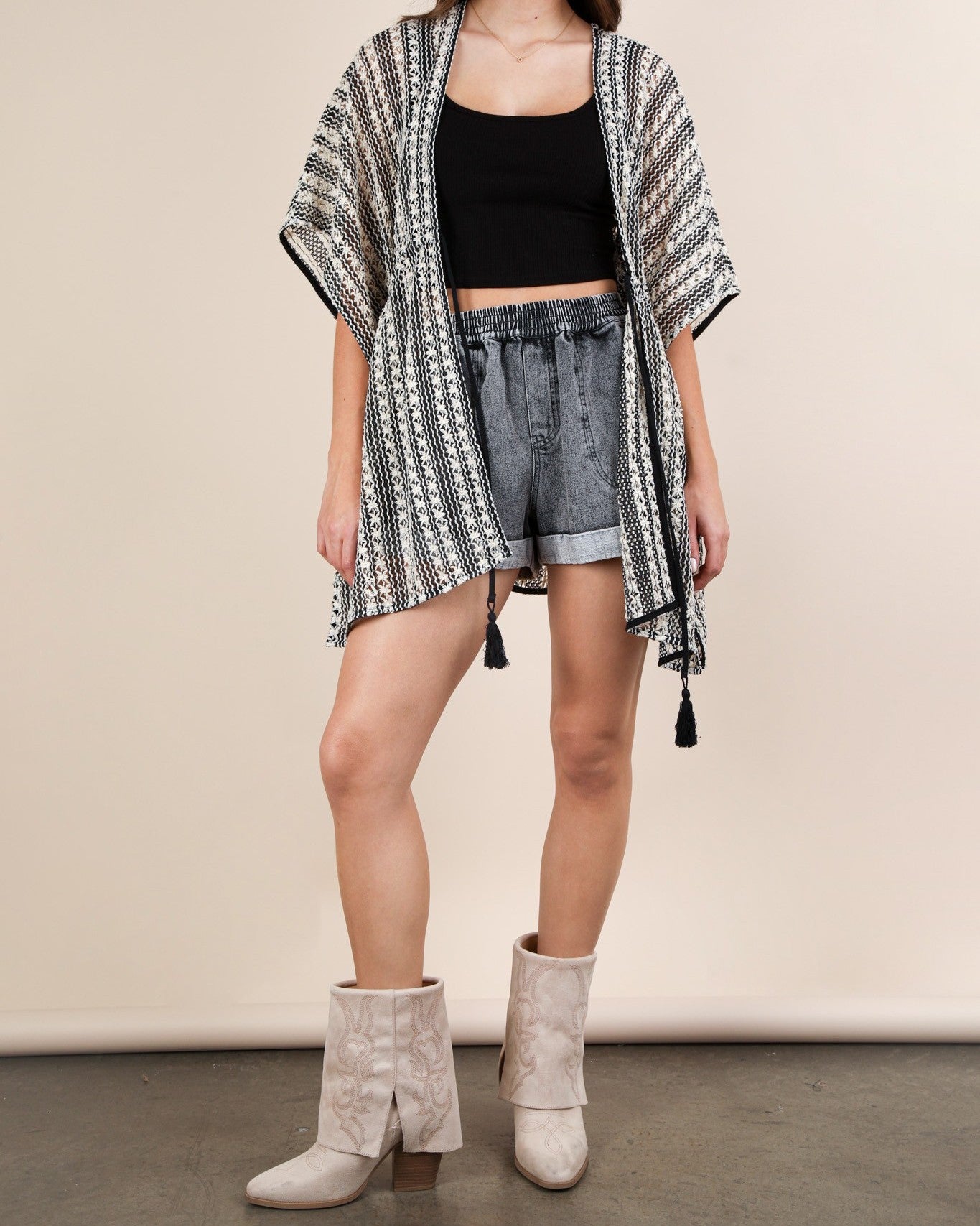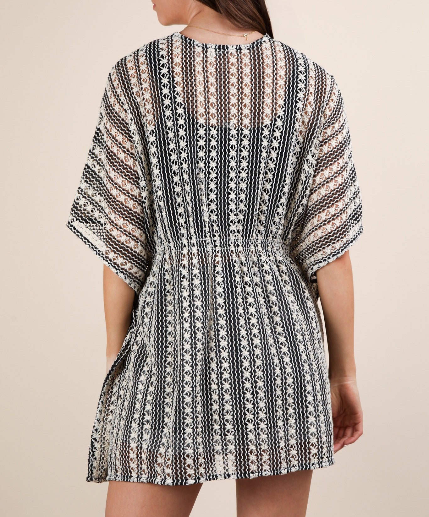A sheer, boho kimono with a cinched waist and tie front closure.