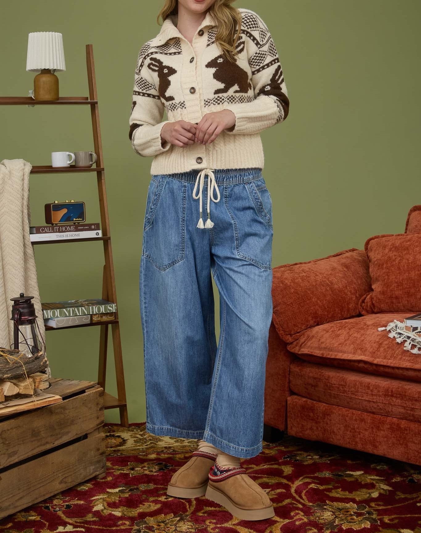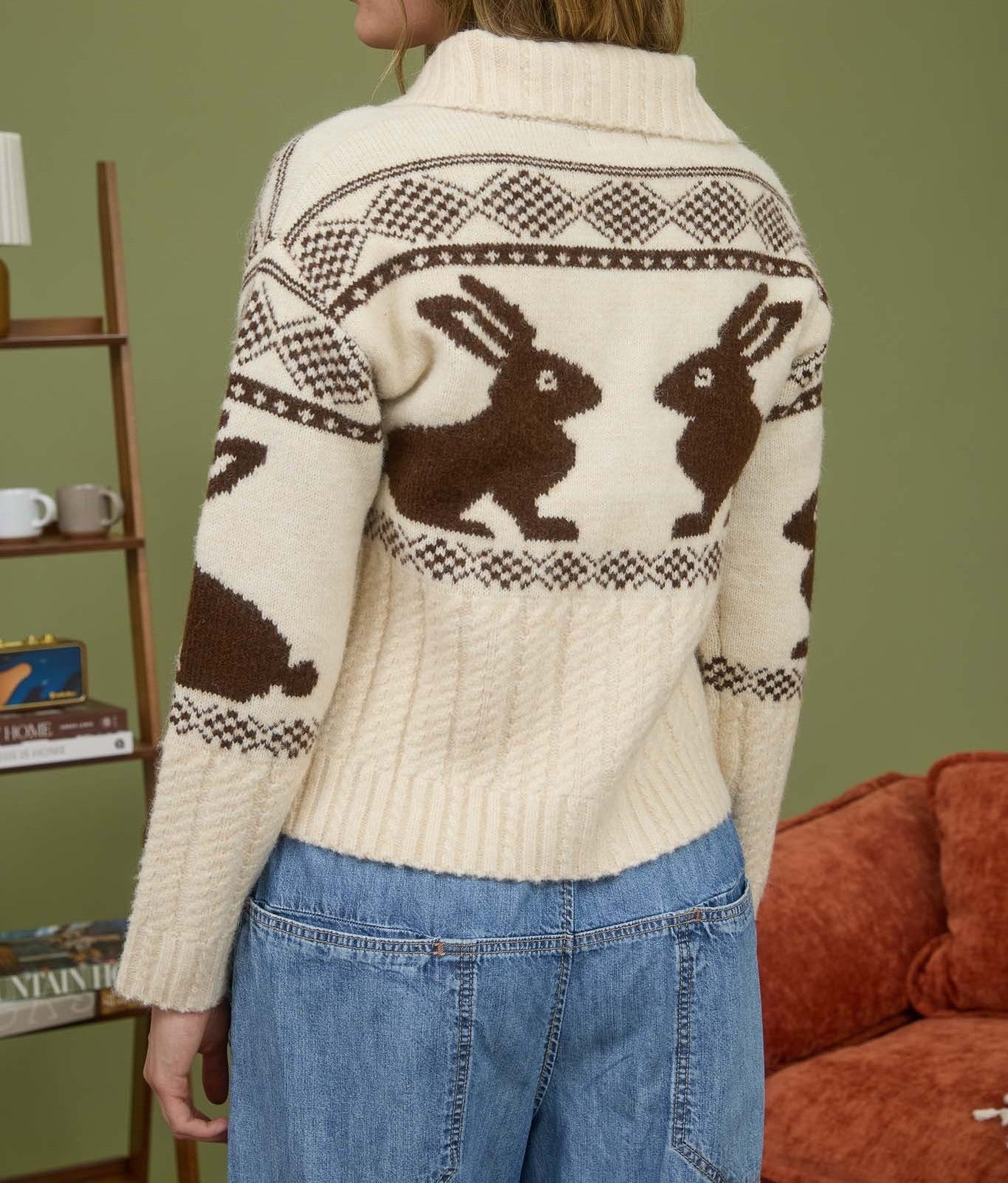 A cute and comfy long-sleeved cardigan with an adorable bunny detail design throughout, a front button closure, and a collared neckline.