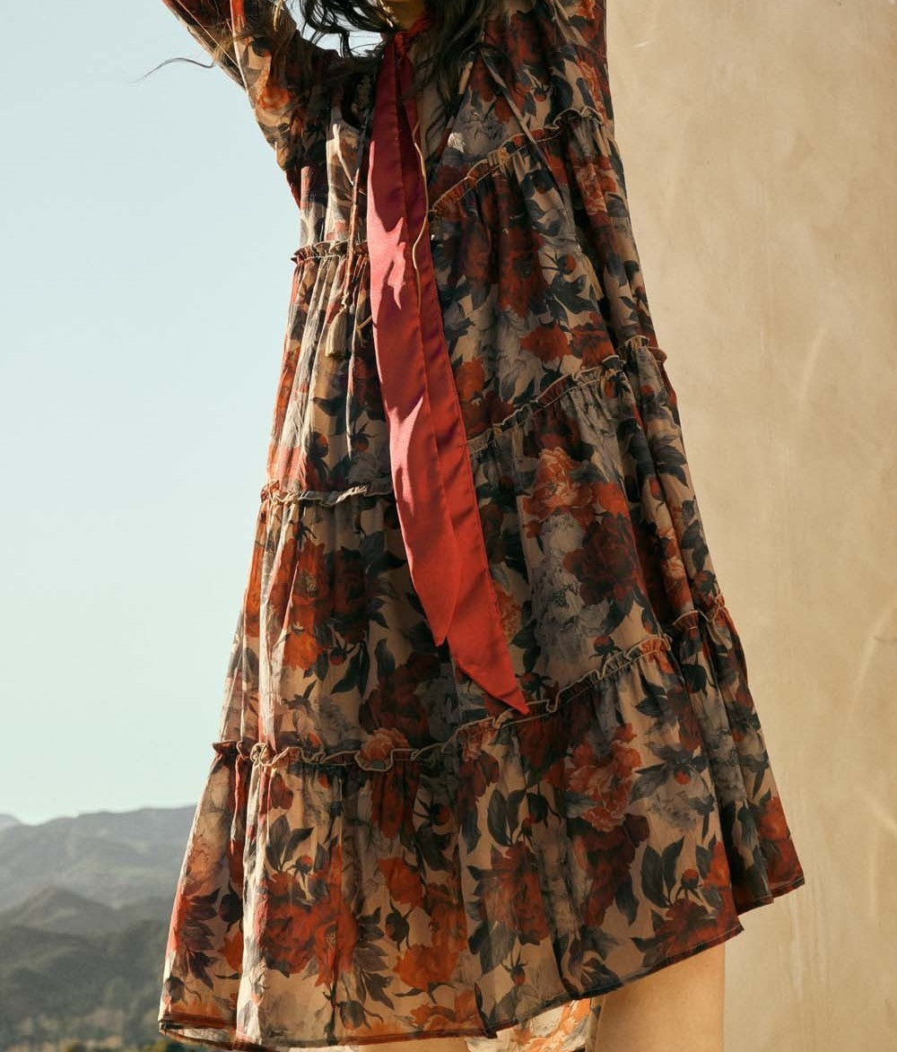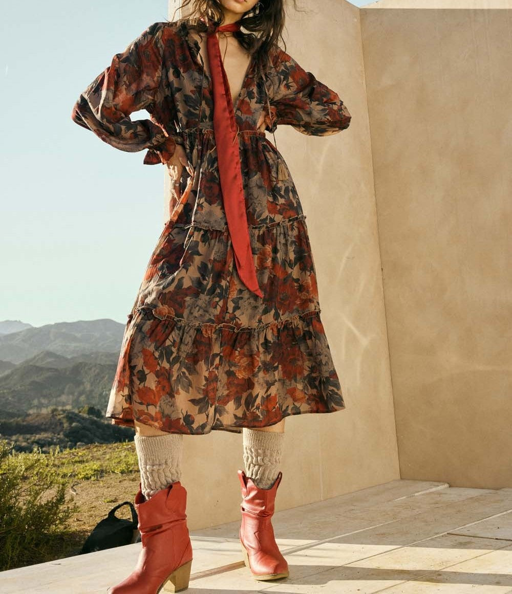 A floral-print woven midi dress with the following features: a deep V neckline with button closure, a ruffle collar with a tassel necktie, long sleeves with ruffle cuffs, a tiered ruffle skirt with ruffle trim and a high waist. knee-length lining with calf length body, and a loose fit.