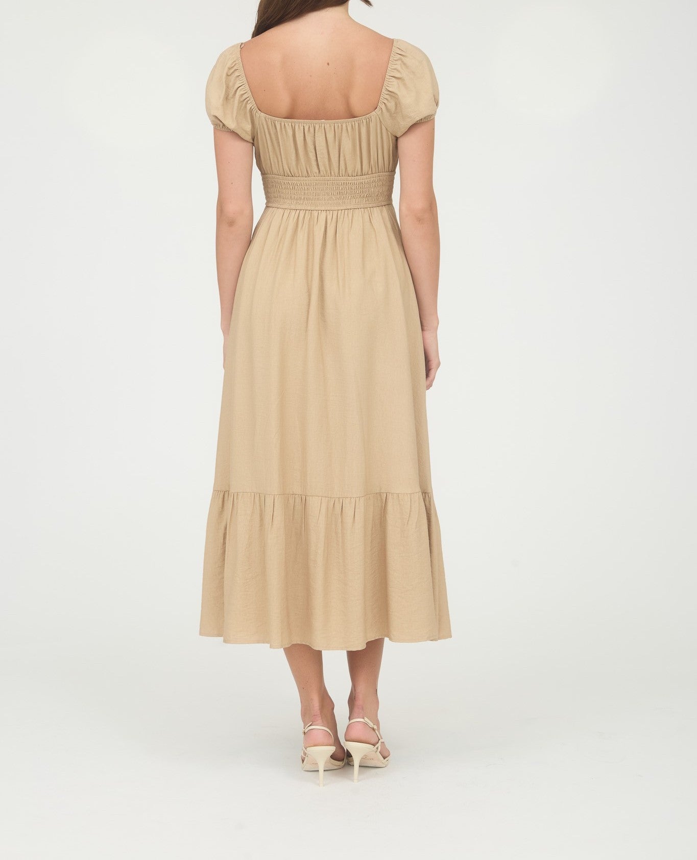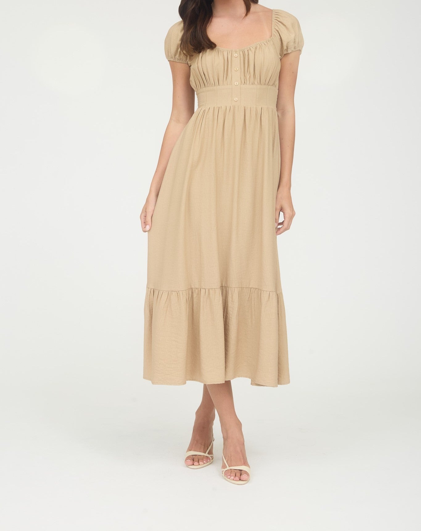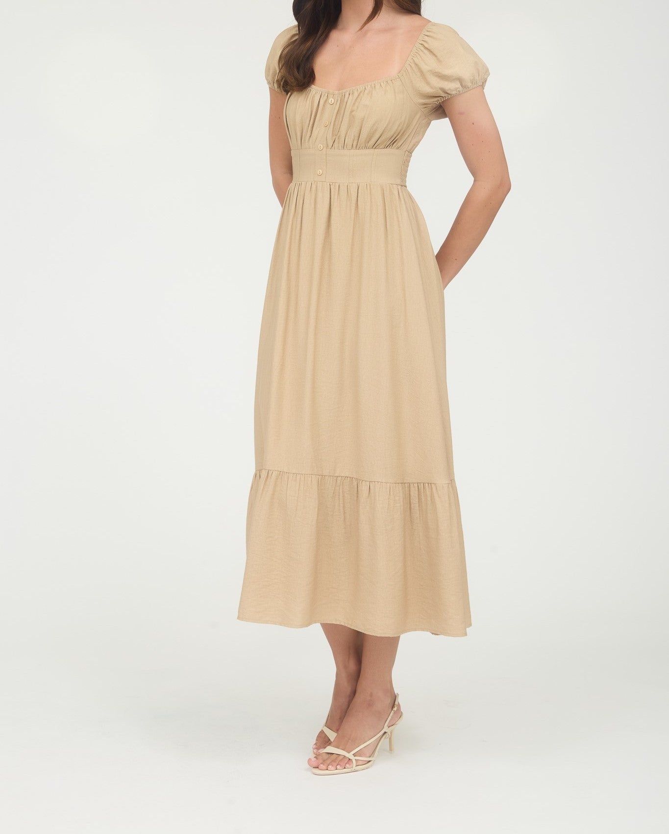 A charming maxi dress that features short puff sleeves, a decorative front button torso closure, a wide elastic waistband, and a tiered skirt.