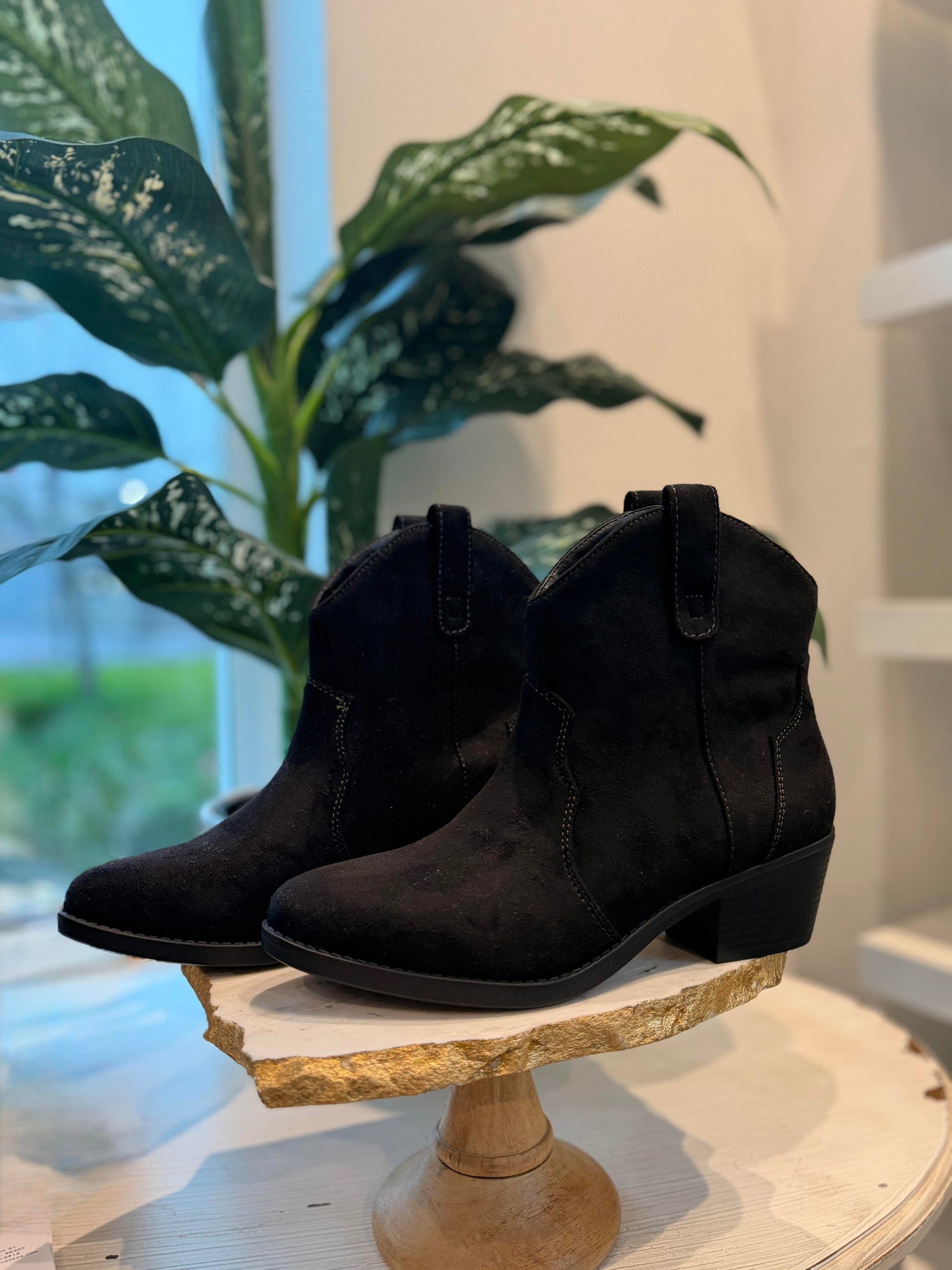 This Western Style black boot is ankle height with stitch detailing, 1 inch heel and side loops.