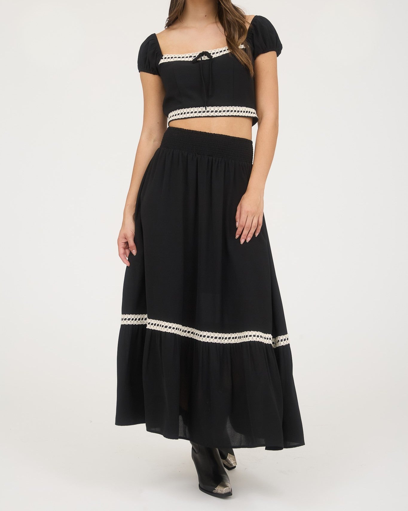 A charming maxi skirt with lace detailing and an elastic waistband. Shop the matching top here: Kayla Top