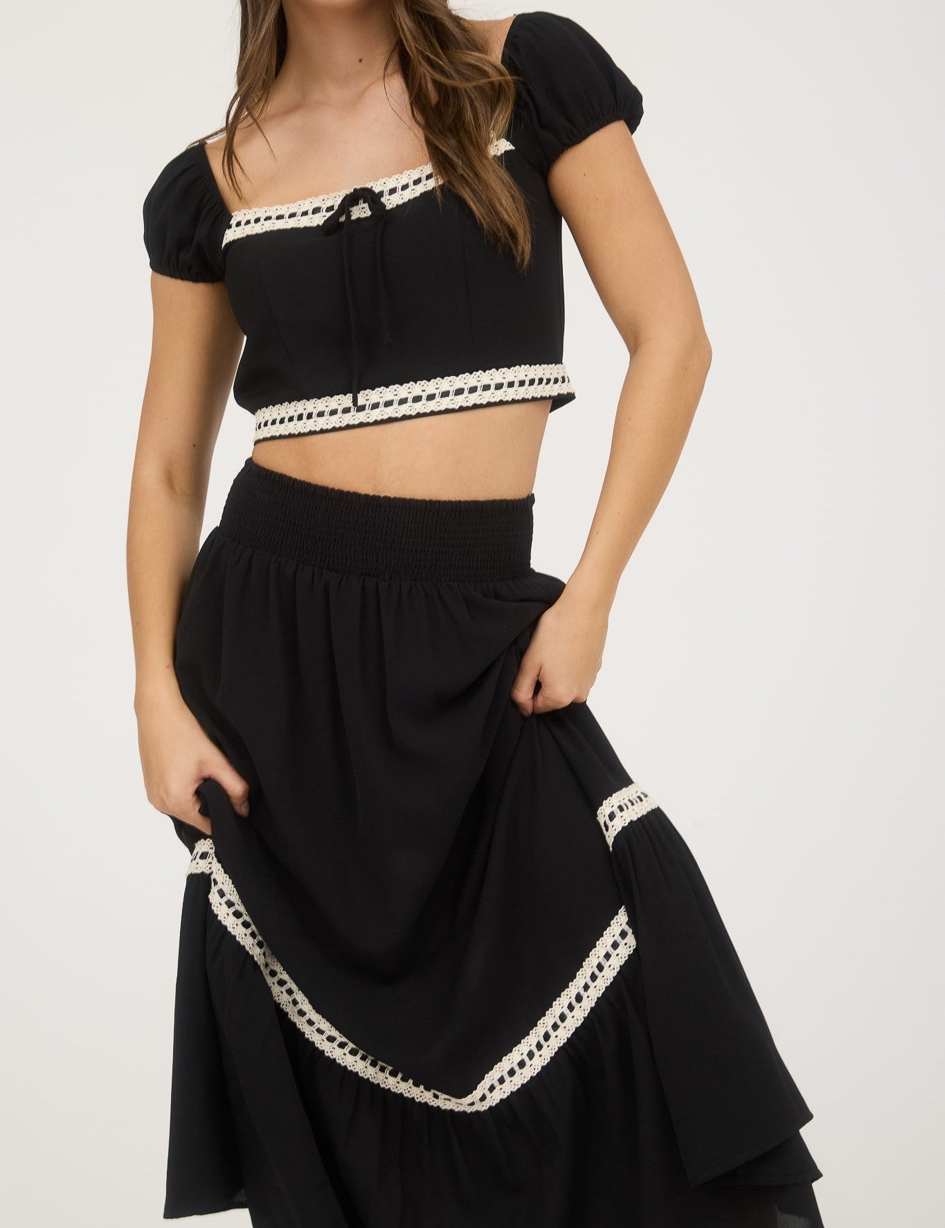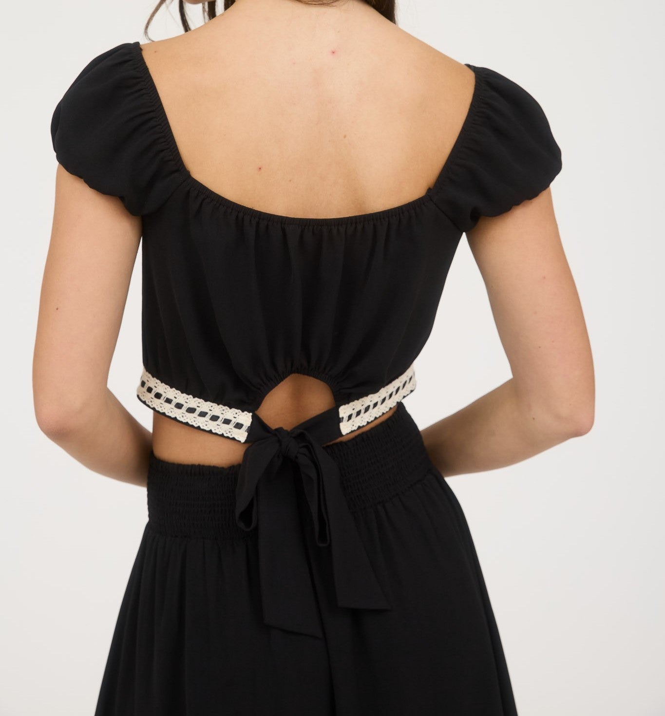 A charming, cropped blouse with short, puffed sleeves, lace detailed lining, a bow tied front detail, and a back hem ribbon tie. Shop the matching skirt: Kayla Skirt
