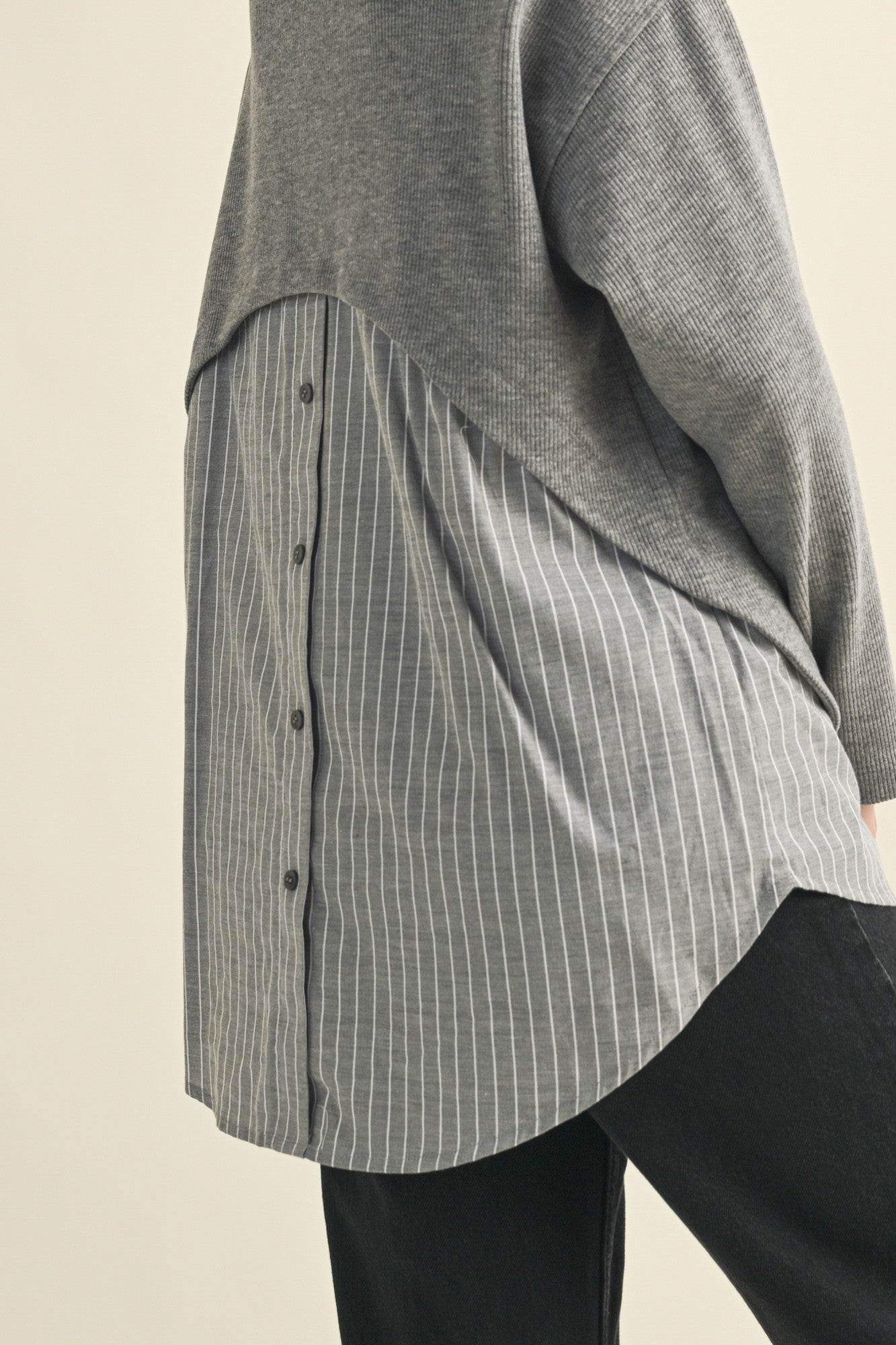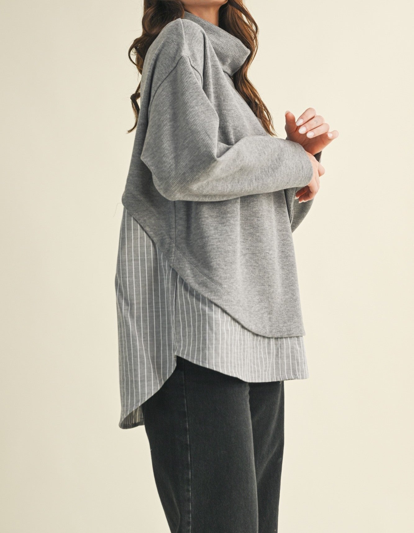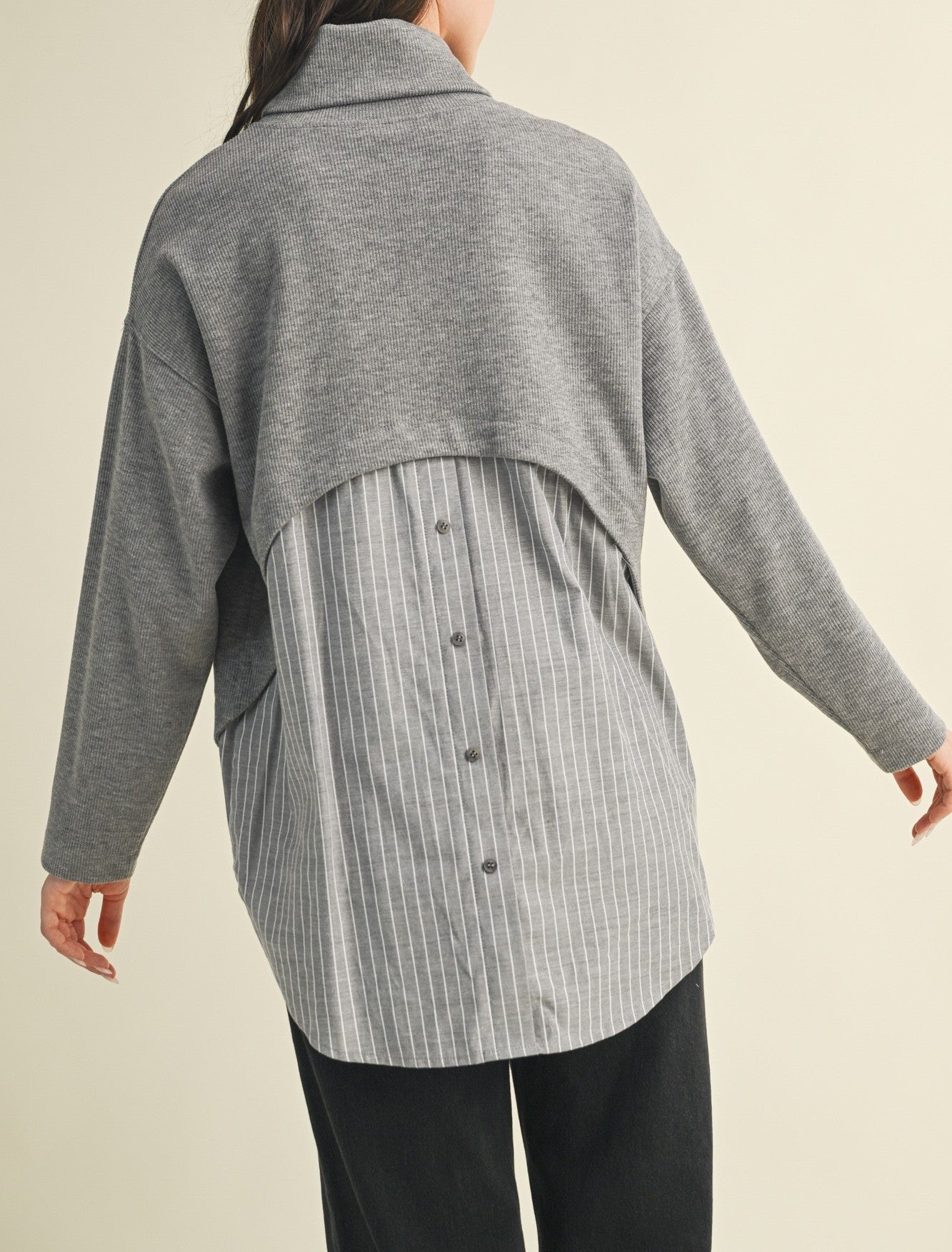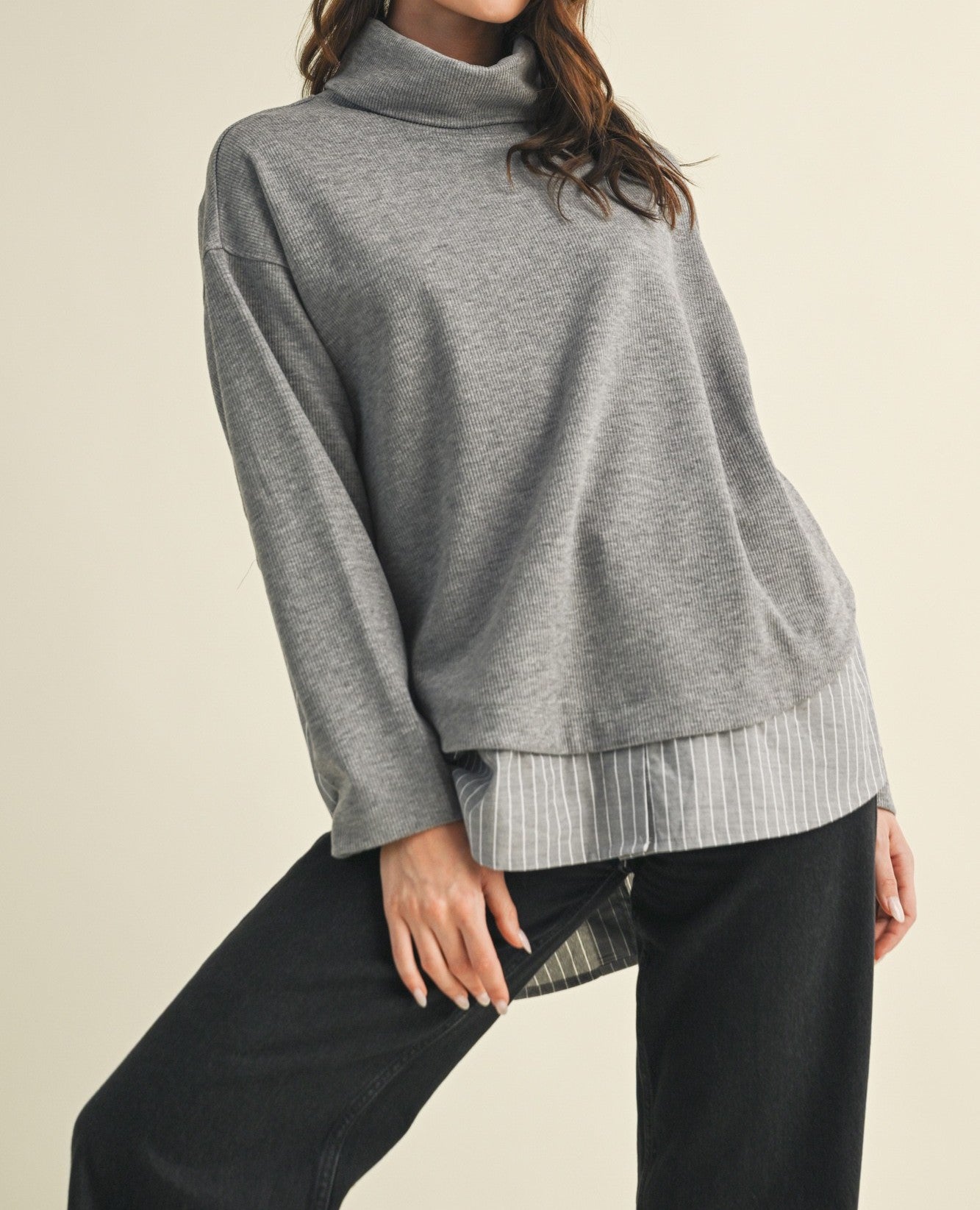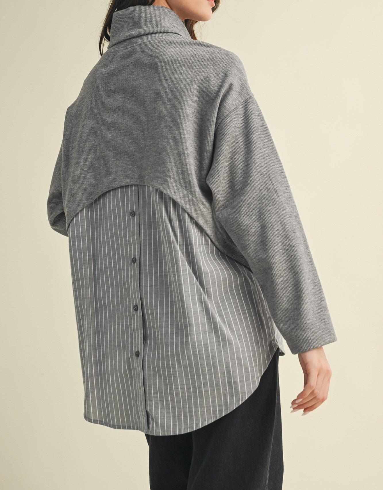 A long sleeved, layered, turtleneck blouse, with long sleeves, a sweater top layer that features a cropped length back, and a back button up bottom layer.