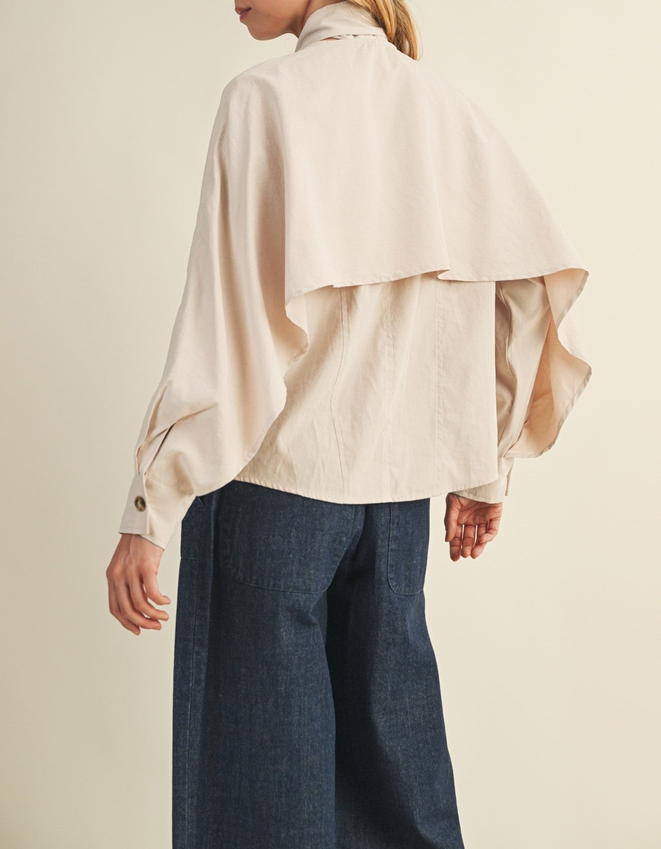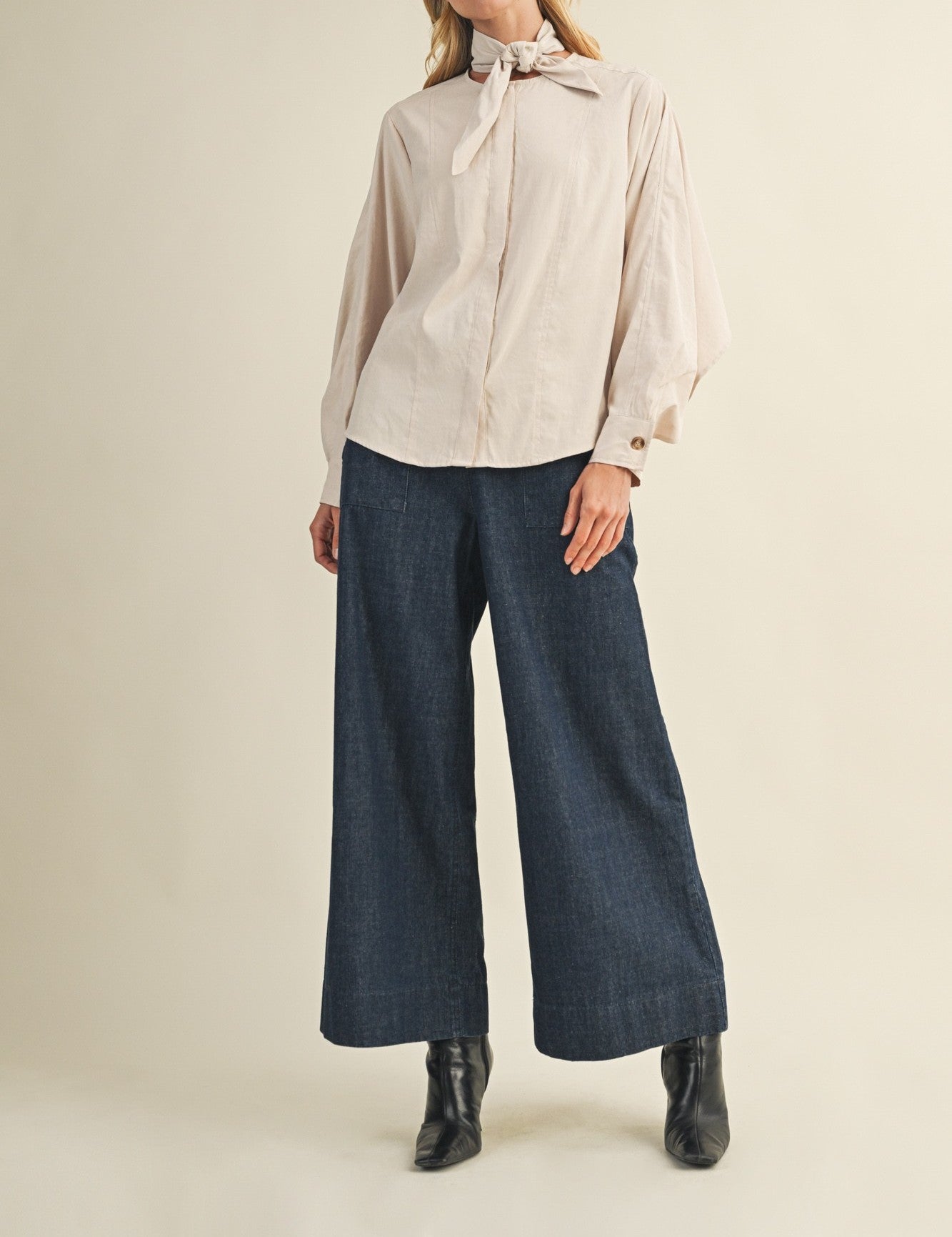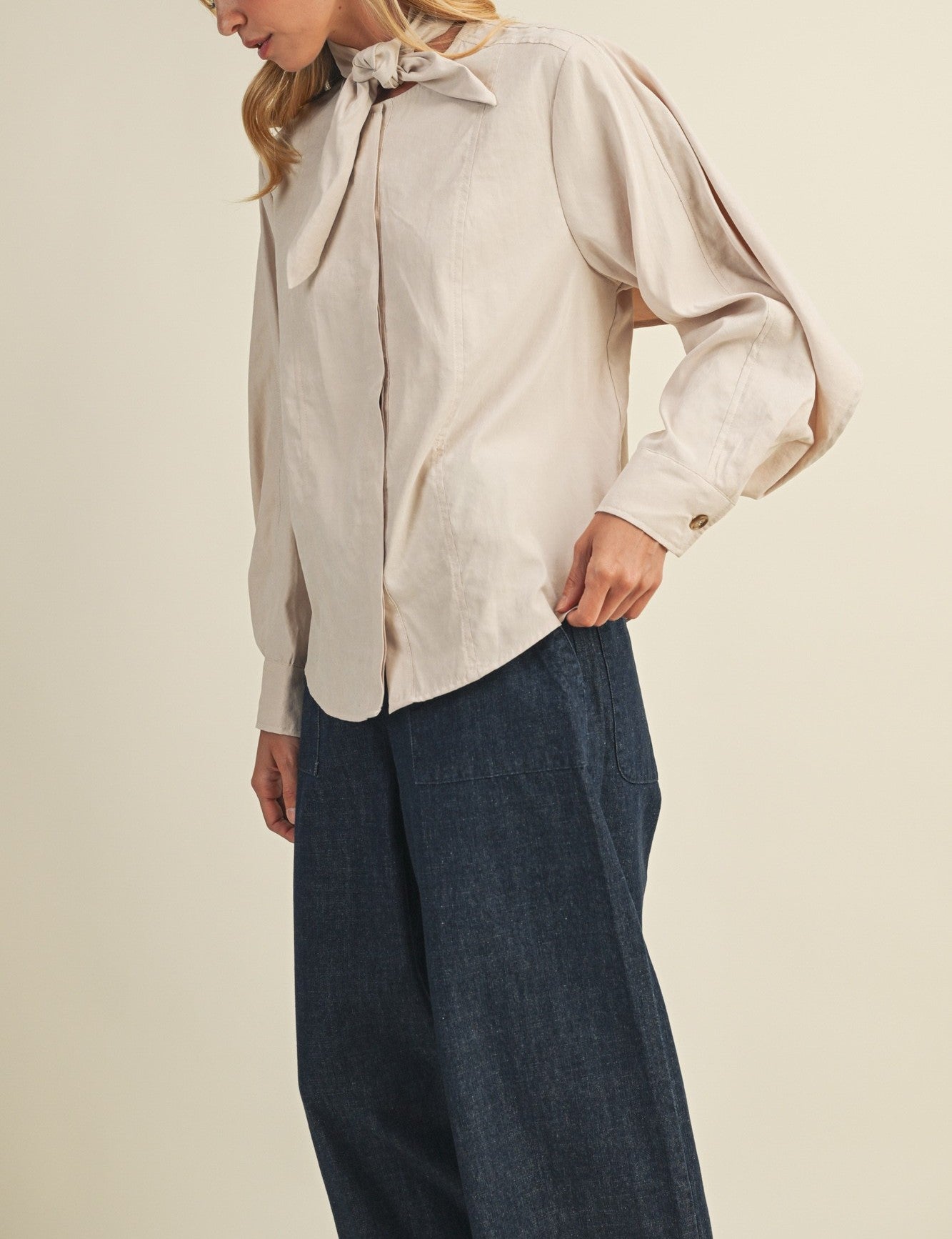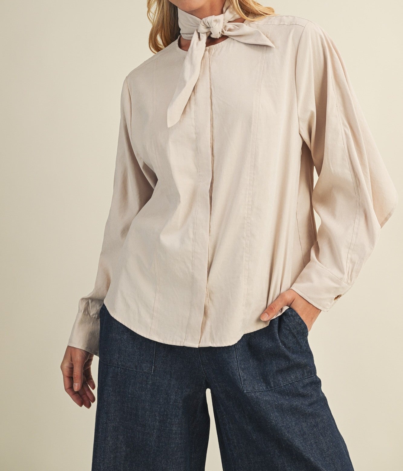 A chic button up top with hidden front button closure, high neckline, bow tie neck detailing, button wrist closures, and an overlay back detail.