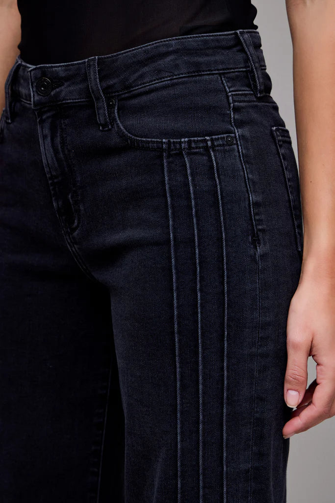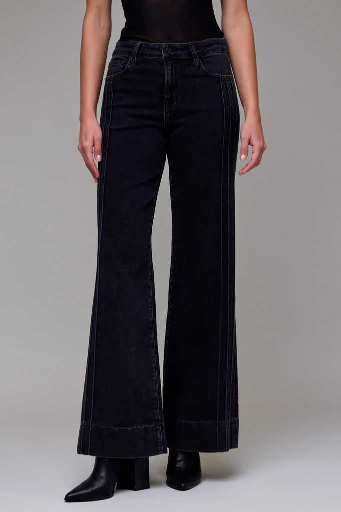 A stylish pair of dark flare jeans with vertical stitch detailing and front and back pockets.
