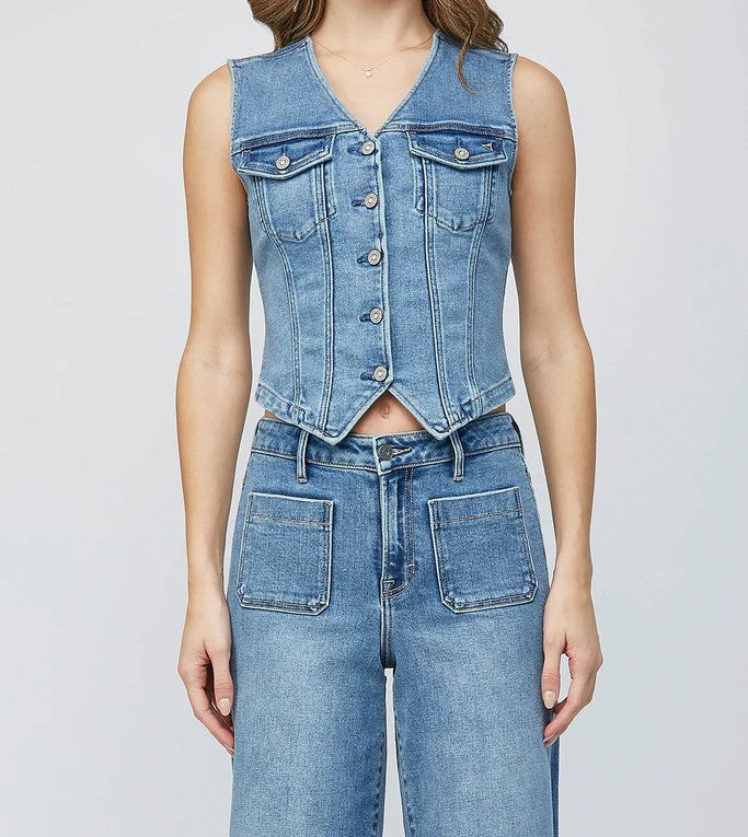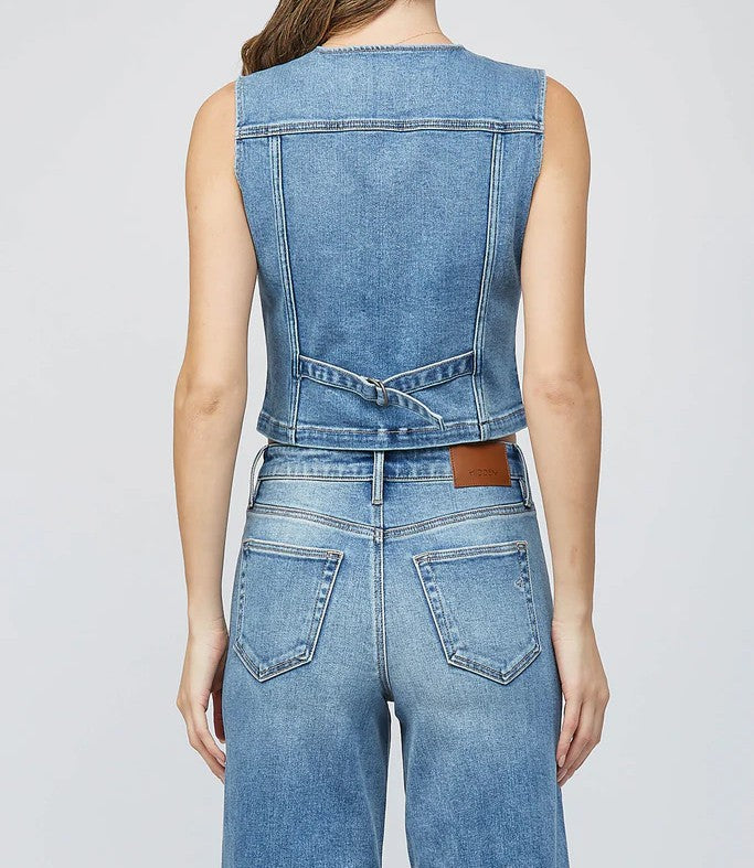 A classic denim wash vest with front button closure, chest pocket detailing, and stitch detailing throughout.