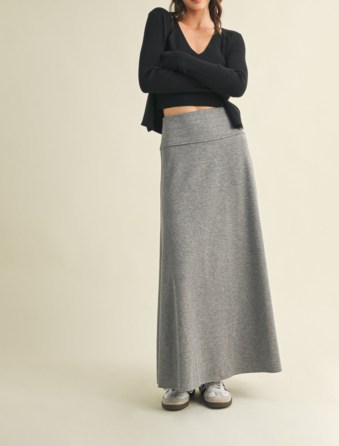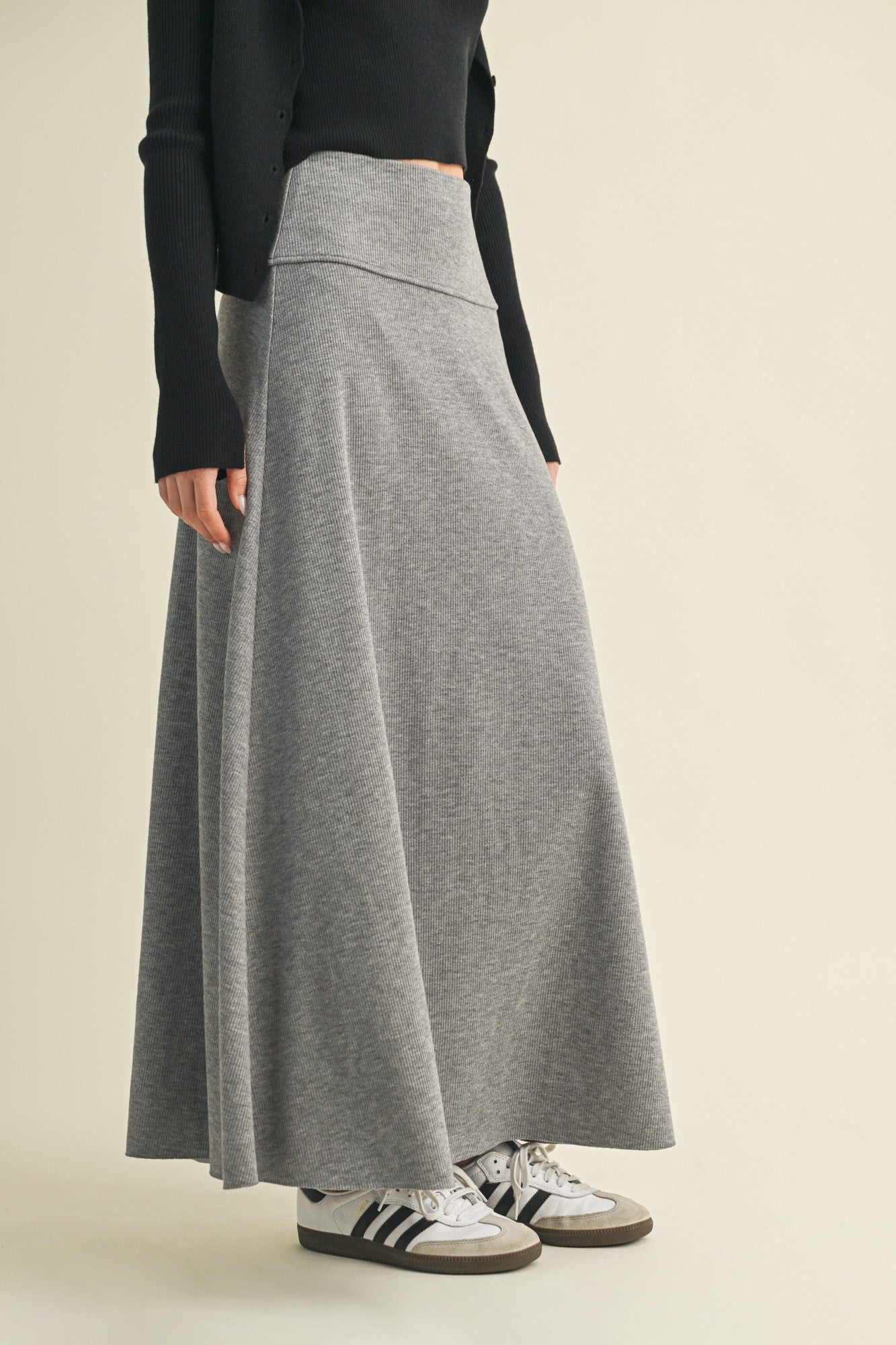 A chic grey maxi skirt with an elastic waist and ribbed fabric detail throughout.