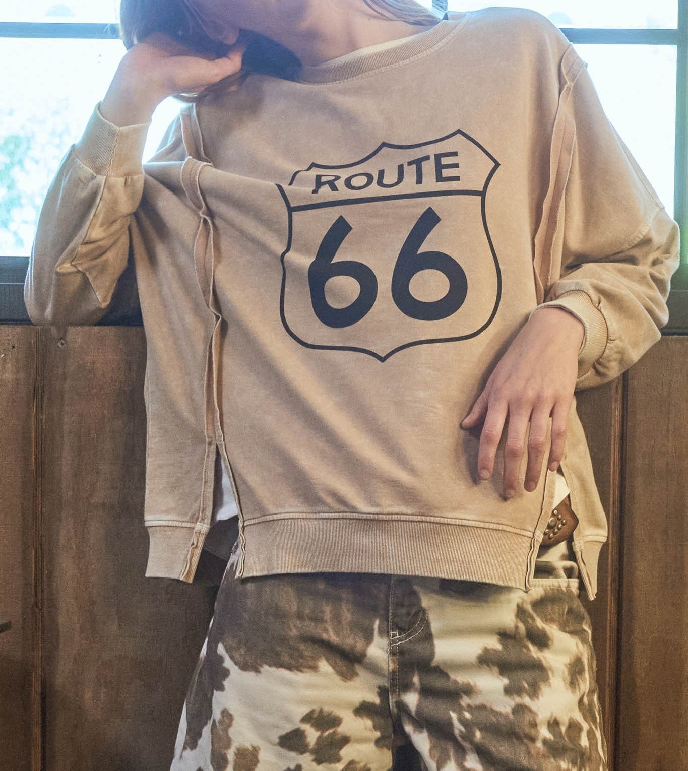 A loose fit sweater with elastic sleeves, a side split hem, outward stitch detailing, and a "Route 66" printed design.